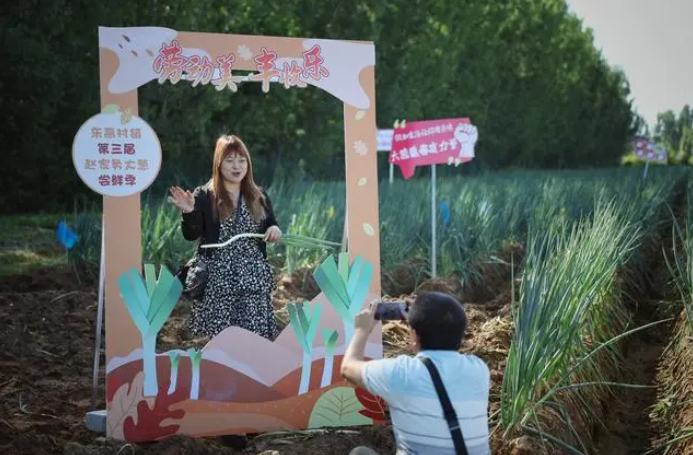 9月20日,平谷區東高村鎮趙家務村,一位游客舉著大蔥留影。新京報記者 薛珺 攝