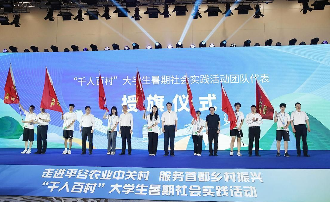 會上,舉行北京市學(xué)校“大思政課”實踐基地揭牌儀式,參會領(lǐng)導(dǎo)對各高校社會實踐隊伍進(jìn)行授旗,實踐隊伍師生進(jìn)行莊嚴(yán)宣誓。按照此次實踐活動安排,在接下來的一個月,我校將有13支師生實踐團(tuán)隊和來自京內(nèi)外67所高校的200余支團(tuán)隊,奔赴平谷全域274個村開展實踐活動,發(fā)揮專業(yè)優(yōu)勢,厚植愛農(nóng)情懷,助力鄉(xiāng)村振興。