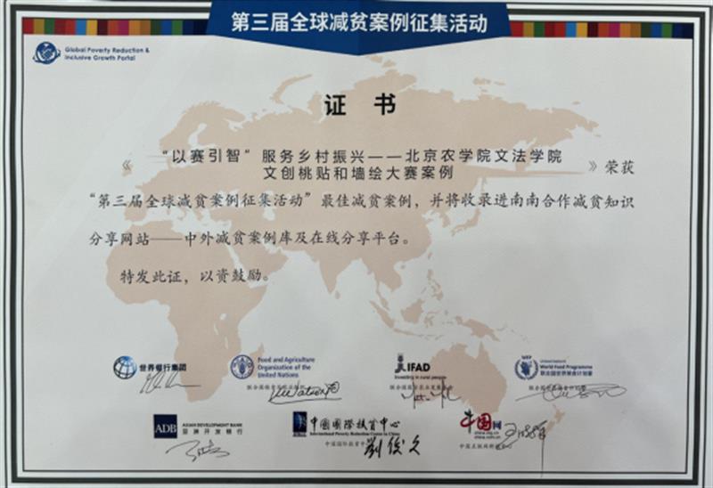 11月11日下午,由中國國際扶貧中心、國際農(nóng)業(yè)發(fā)展基金、聯(lián)合國糧食及農(nóng)業(yè)組織、世界糧食計劃署和中國互聯(lián)網(wǎng)新聞中心聯(lián)合主辦的2022全球減貧伙伴研討會在北京舉行,會上發(fā)布了“第三屆全球減貧案例”名單并舉行頒獎儀式。北京農(nóng)學(xué)院報送的《“以賽引智”服務(wù)鄉(xiāng)村振興——北京農(nóng)學(xué)院文法學(xué)院文創(chuàng)桃貼和墻繪大賽案例》入選“第三屆全球減貧案例征集活動”最佳減貧案例,并將收錄進南南合作減貧知識分享網(wǎng)站——中外減貧案例庫及在線分享平臺。