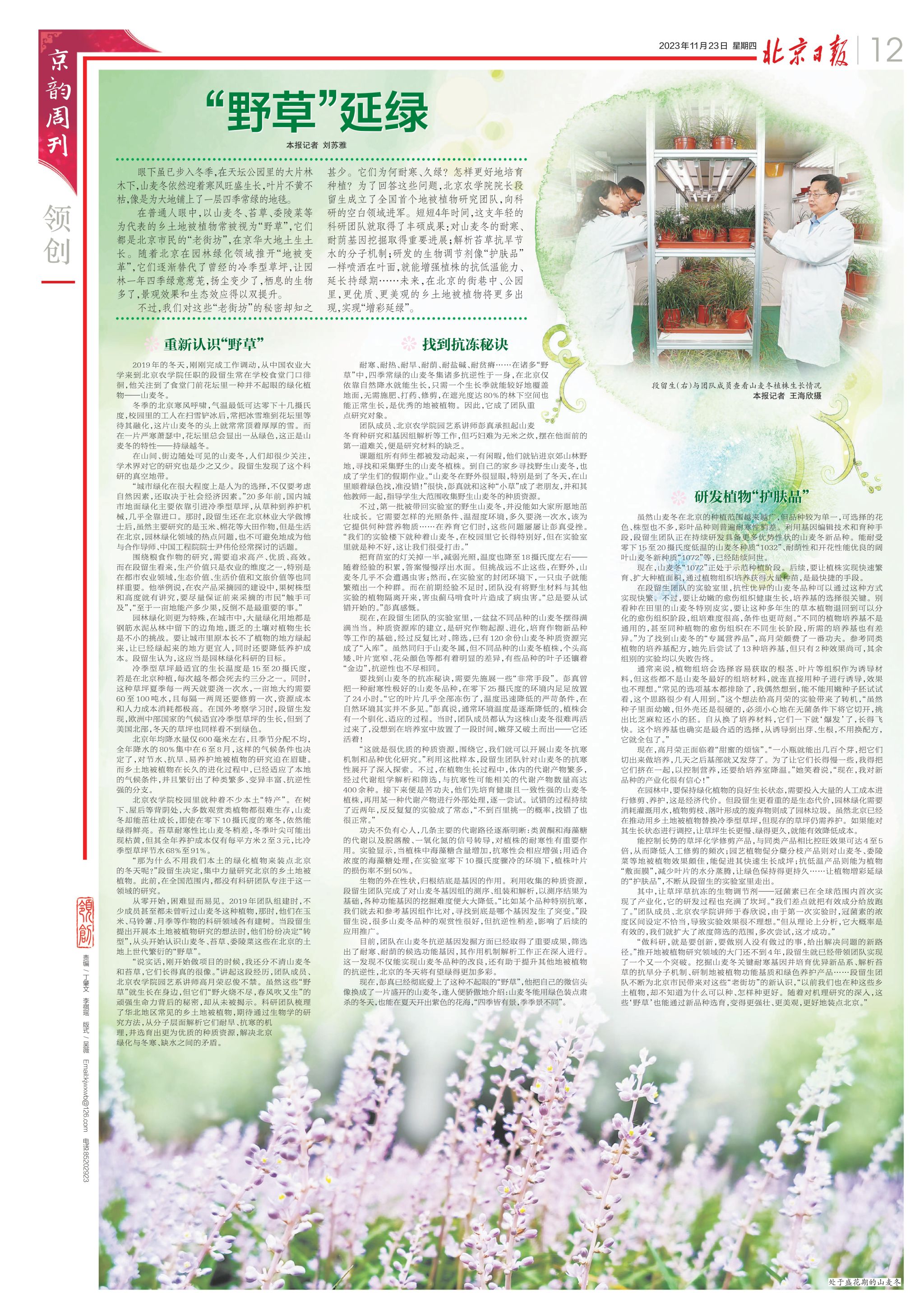 “做科研,就是要創新,要做別人沒有做過的事,給出解決問題的新路徑。”推開地被植物研究領域的大門還不到4年,段留生就已經帶領團隊實現了一個又一個突破。挖掘山麥冬關鍵耐寒基因并培育優異新品系、解析苔草的抗旱分子機制、研制地被植物功能基質和綠色養護產品……段留生團隊不斷為北京市民帶來對這些“老街坊”的新認識,“以前我們也在種這些鄉土植物,卻不知道為什么可以種、怎樣種更好。隨著對機理研究的深入,這些‘野草’也能通過新品種選育,變得更強壯、更美觀,更好地裝點北京。”