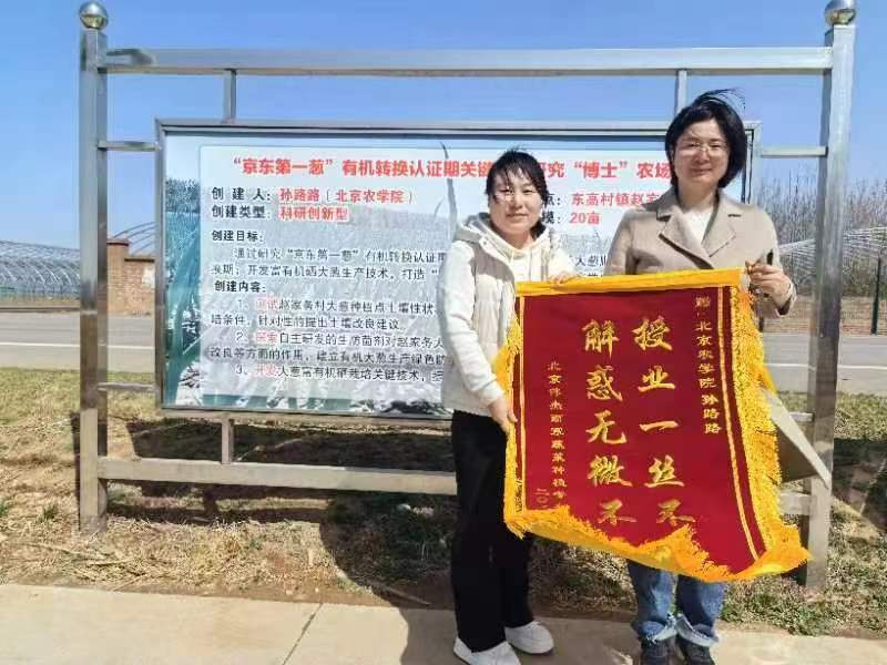 在東高村鎮大蔥博士農場,大家實地調研了大蔥育苗情況和基地早春蔬菜生產情況。老師們對早春大蔥苗和目前基地種植的花菜、甘藍、水果洋蔥等前茬蔬菜的管理提出管理措施。大家還一起深入討論了大蔥四季供應策略的問題。該村北京偉杰雨寒蔬菜專業種植合作社社長張國偉還為孫路路送上了錦旗,“感謝孫老師過去兩年對合作社各方面的幫助和支持,讓我們嘗到了科技興農的甜頭?!?/p>