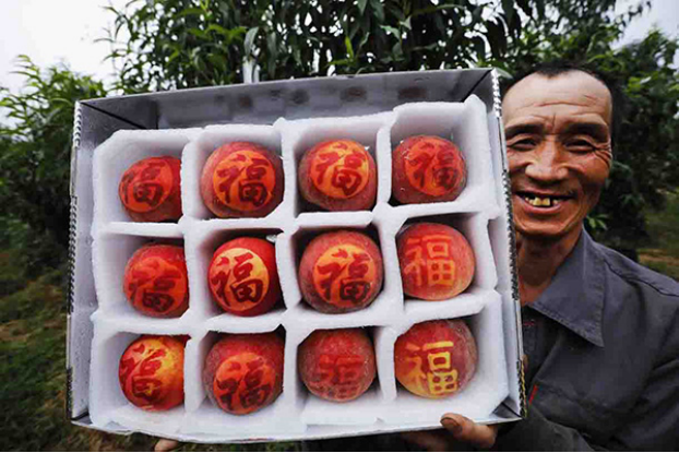 果農展示“長”有福字的文創桃