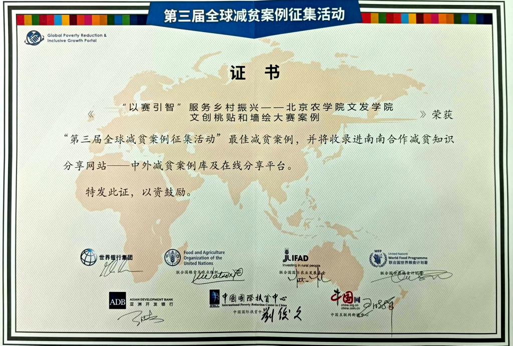 我校報送的《“以賽引智”服務鄉村振興——北京農學院文發學院文創桃貼和墻繪大賽案例》入選“第三屆全球減貧案例征集活動”最佳減貧案例,并將收錄進南南合作減貧知識分享網站——中外減貧案例庫及在線分享平臺。黨委常委、副院長段留生出席大會并代表學校領獎。