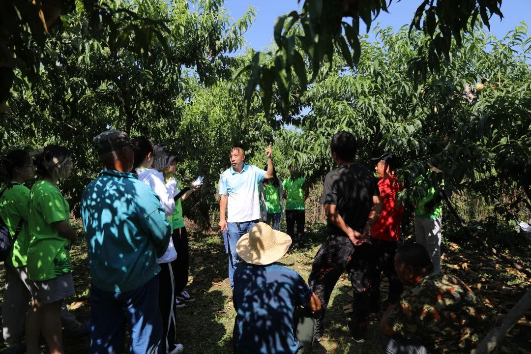 生物與資源環境學院教師劉悅萍帶領暑期實踐團先后到大華山鎮后北宮村、劉家店鎮胡店村桃樹種植基地。在桃園里,劉悅萍與果農深度交流桃樹生長過程中病蟲害的生物防治問題、大桃品質問題。同時,在桃園里為學生們上起了課。