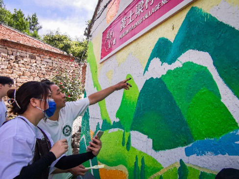 老師和同學們一到村里,就開始忙活起來。他們首先要做的,是為黃土梁村設計制作主題墻繪。團隊前期已經(jīng)設計好主題畫稿,準備好了材料。到了現(xiàn)場,大家分工協(xié)作,熱火朝天地繪制起來。
