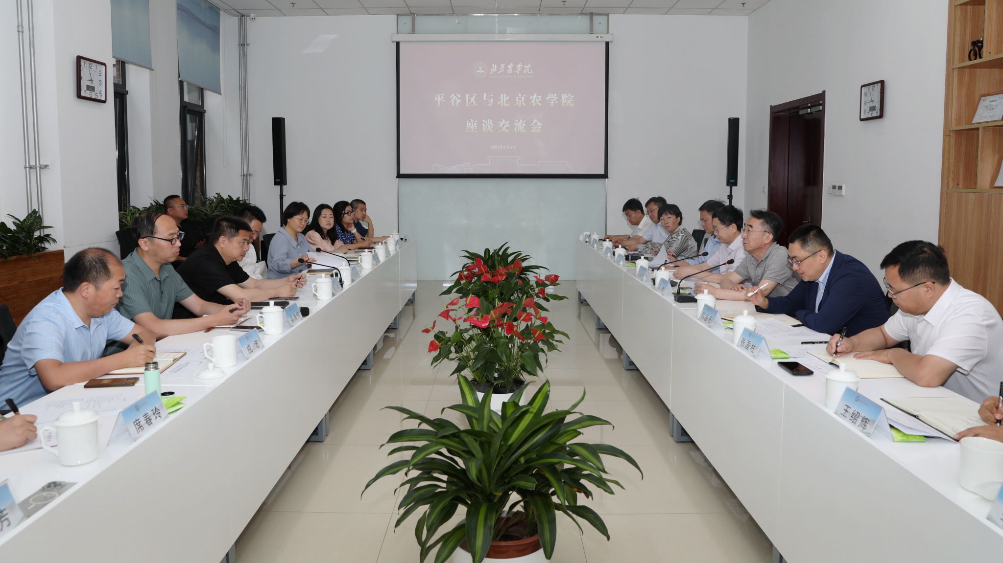 平谷區相關部門負責人,中國農業國際合作促進會、北京淞浦智能科技產業發展有限公司等單位負責人,學校相關職能部門和二級學院負責人參加座談交流。