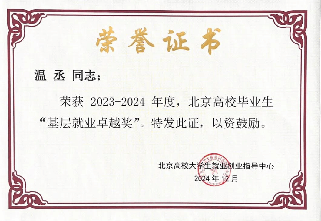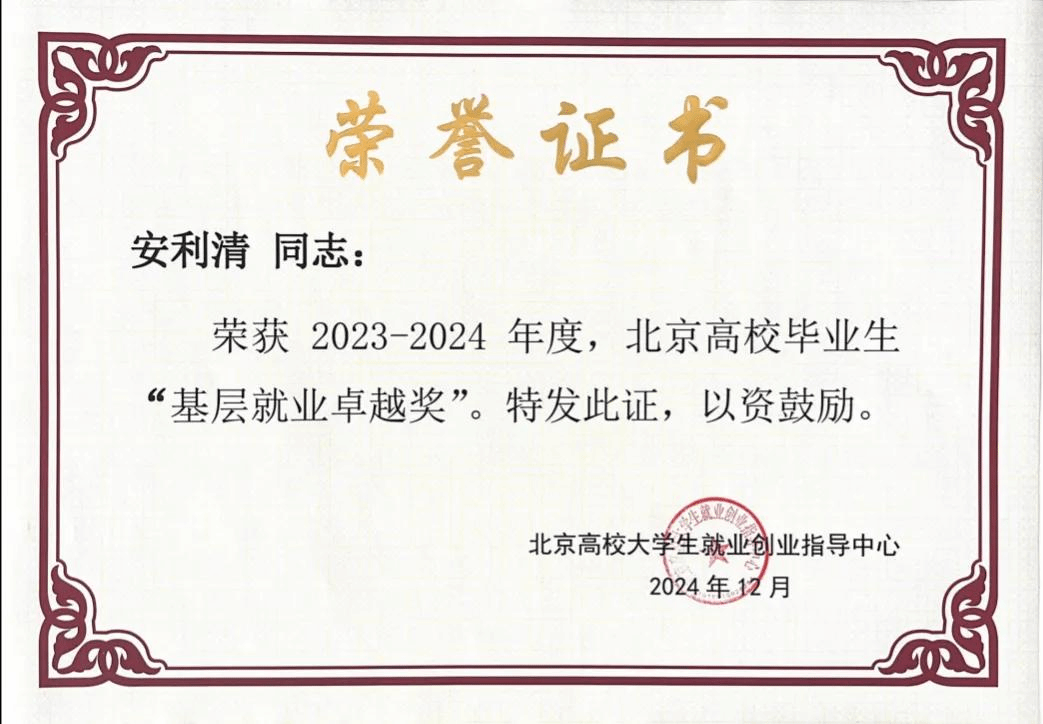 據悉,“高校畢業生基層就業卓越獎”是為獎勵赴基層就業并做出突出業績的普通高校畢業生和普通高校在指導服務大學生赴基層就業工作方面做出突出貢獻的教師。此次共有58名畢業生獲評北京市級“基層就業卓越獎”,78名教師獲評北京市級“基層就業卓越獎”教師榮譽。