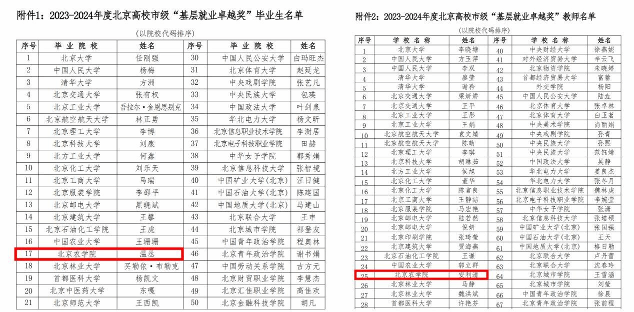 近日,北京市教育委員會、北京高校大學生就業創業指導中心公布2023-2024年度北京高校市級“基層就業卓越獎”獲獎名單。我校文法與城鄉發展學院2013級畢業生溫丞、生物與資源環境學院輔導員安利清老師獲評“基層就業卓越獎”。