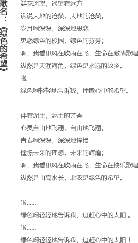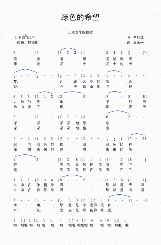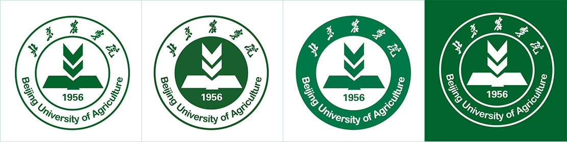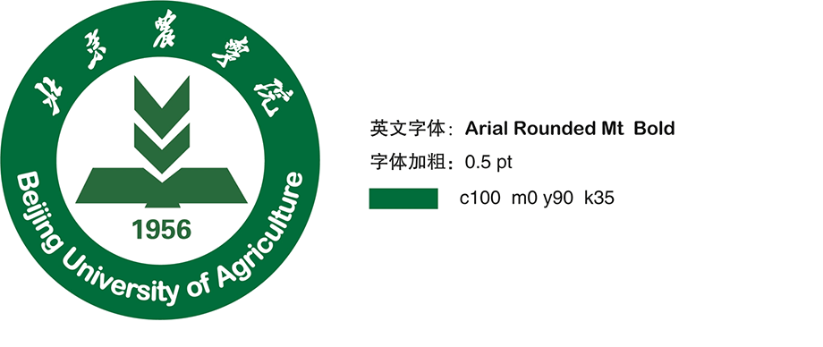 內(nèi)涵:學(xué)校的校徽主體造型采用同心圓環(huán)圖形,型似充滿動感的車輪,寓意著學(xué)校滾滾向前的發(fā)展態(tài)勢;兩圓環(huán)之間上半部分為學(xué)校中文毛體手書體名稱,下半部分為英文校名 “Beijing University of Agriculture”,英文字體:Arial Rounded Mt Bold,字體加粗:1px,標識內(nèi)心設(shè)計以麥穗與書籍組合成造型圖案,其下方為學(xué)校辦學(xué)起始年份“1956”;麥穗象征著農(nóng)業(yè),書籍象征著知識,麥穗與書籍的組合寓意北農(nóng)學(xué)子扎根于知識的土壤,汲取知識的力量茁壯成長;圖案的顏色采用濃綠色(c100 m0 y90 k35),寓意為生命和希望。